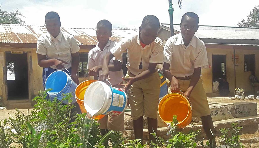 "It used to take us nearly an hour to fetch water from the swamp. It would make us late for school. Now that we have water at school, we can be on time and don't miss class." – Amos (14), pictured far right